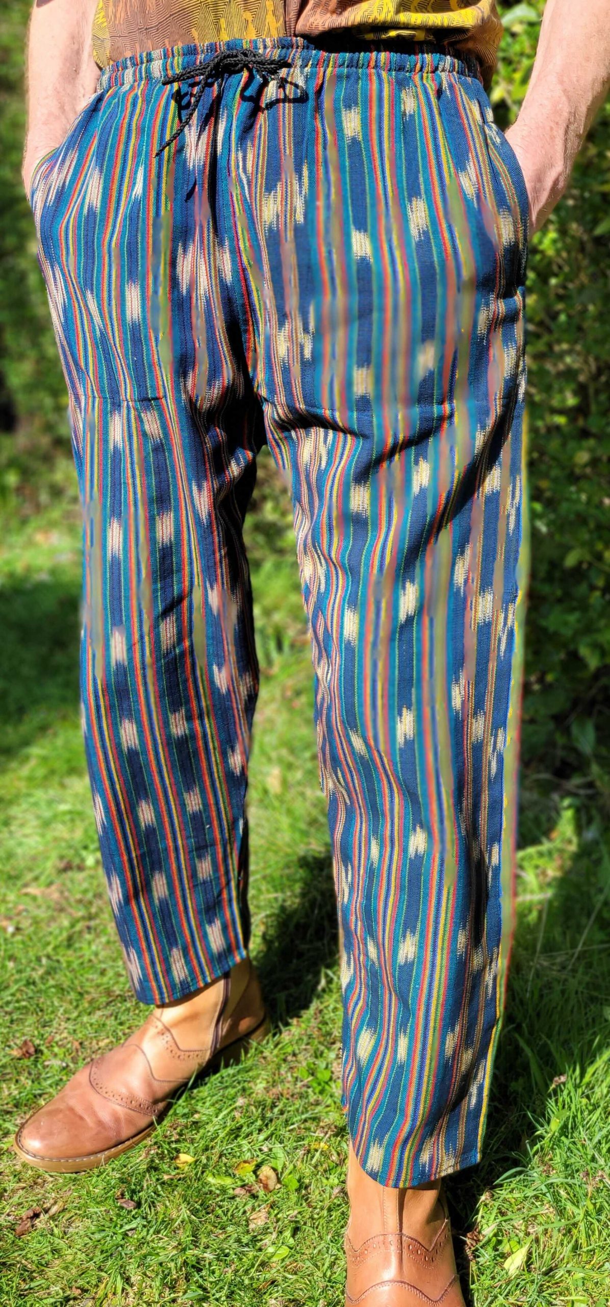 Hand woven trousers from the beautiful region of Lago Atitlan, Guatemala. Bought direct from the weavers who use traditional designs and colours to create comfy well made trousers. 100% cotton and perfect for lounging around and enjoying life!