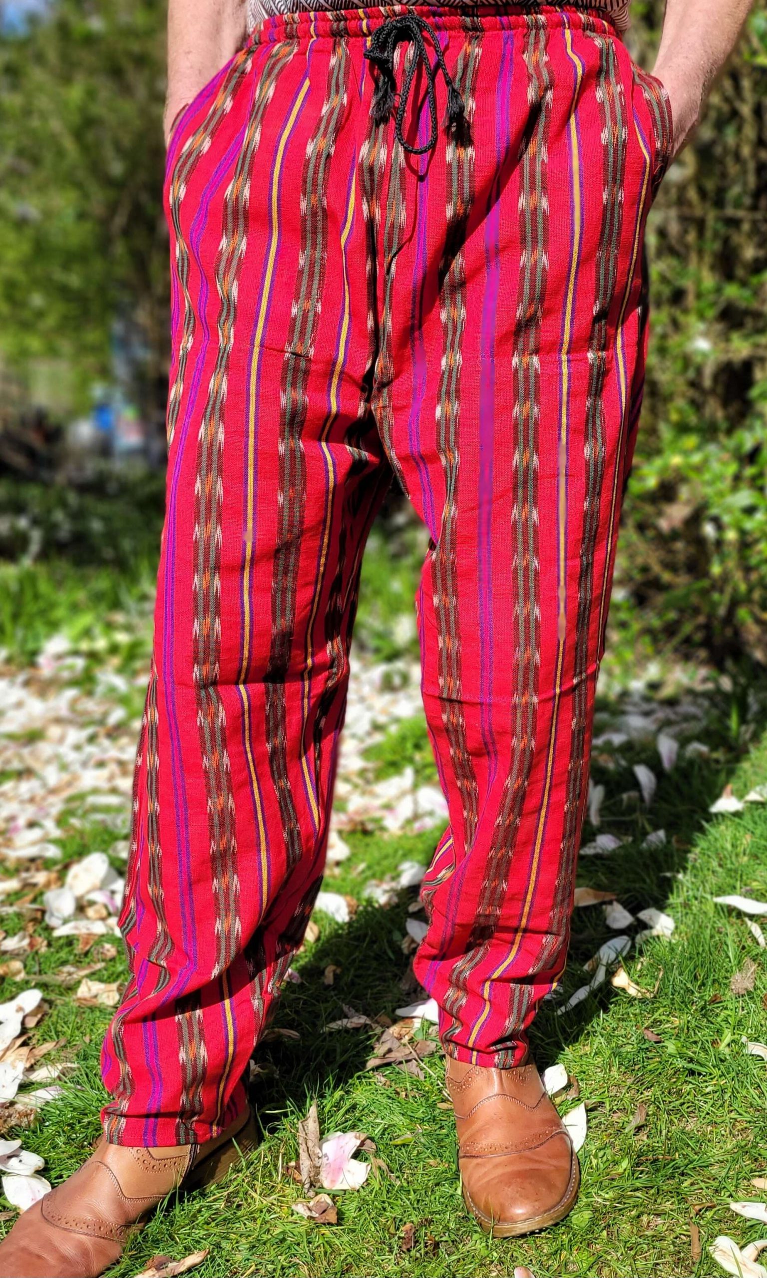 Hand woven trousers from the beautiful region of Lago Atitlan, Guatemala. Bought direct from the weavers who use traditional designs and colours to create comfy well made trousers. 100% cotton and perfect for lounging around and enjoying life!