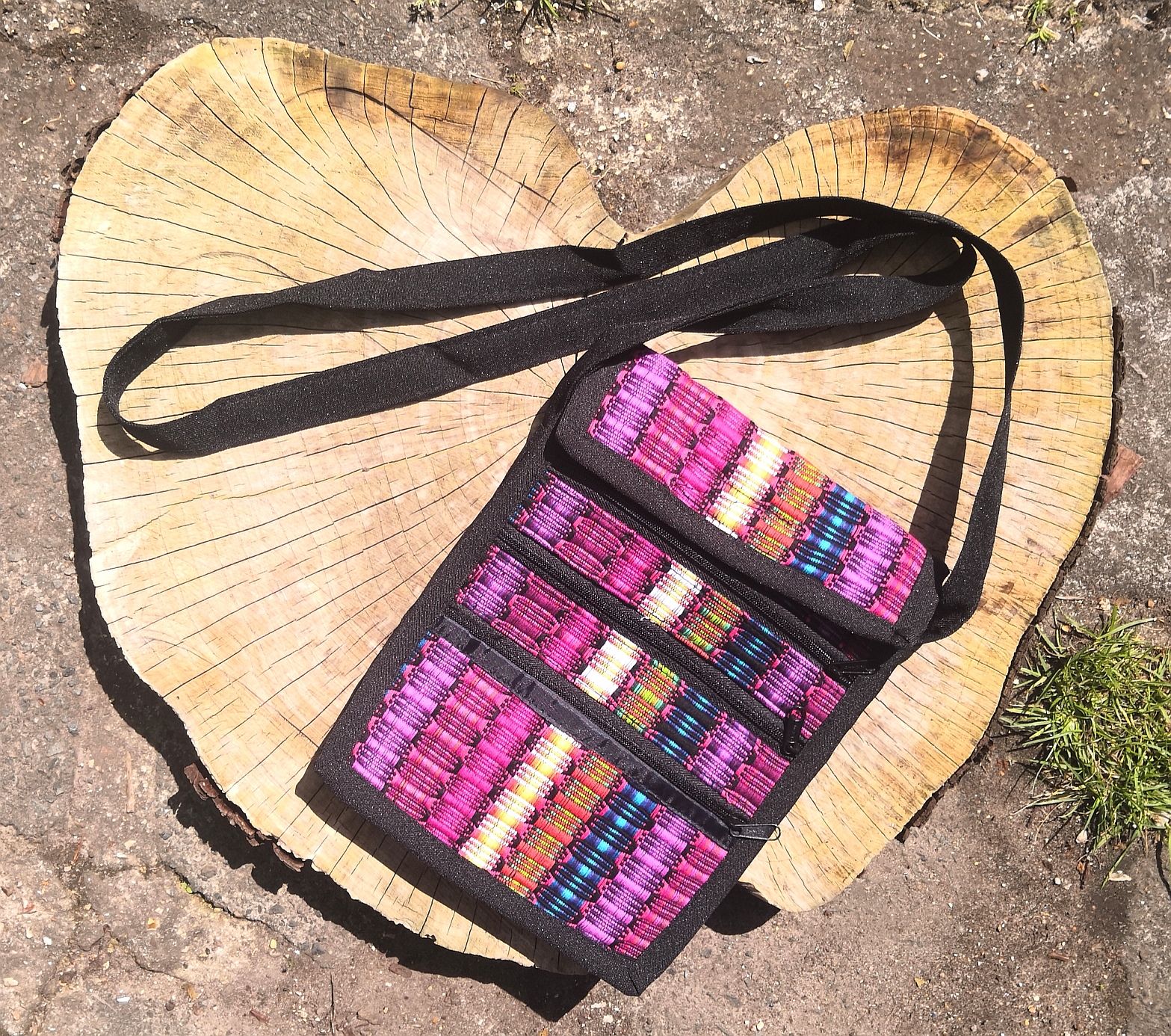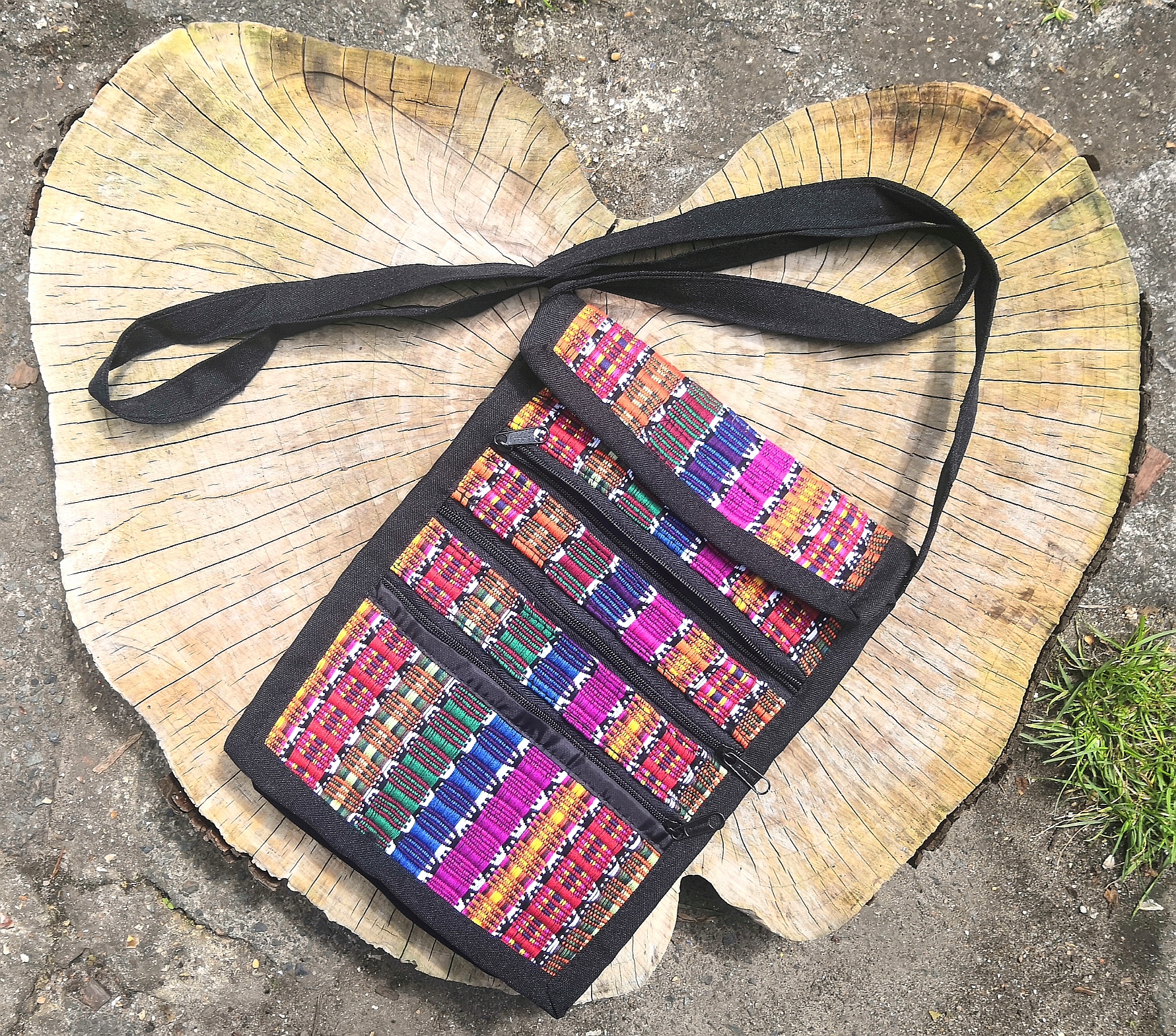 Hand woven Extra large zip bag with top Velcro fastening. Great for festivals and travelling. Size: 24cm long/18.5cm wide. Three zipped compartments in addition to main compartment. First zipped compartment 15cm/16cm. Second zipped compartment 11cm/16cm. Third zipped compartment 8cm/16cm. Strap 55cm drop from shoulder to bag.