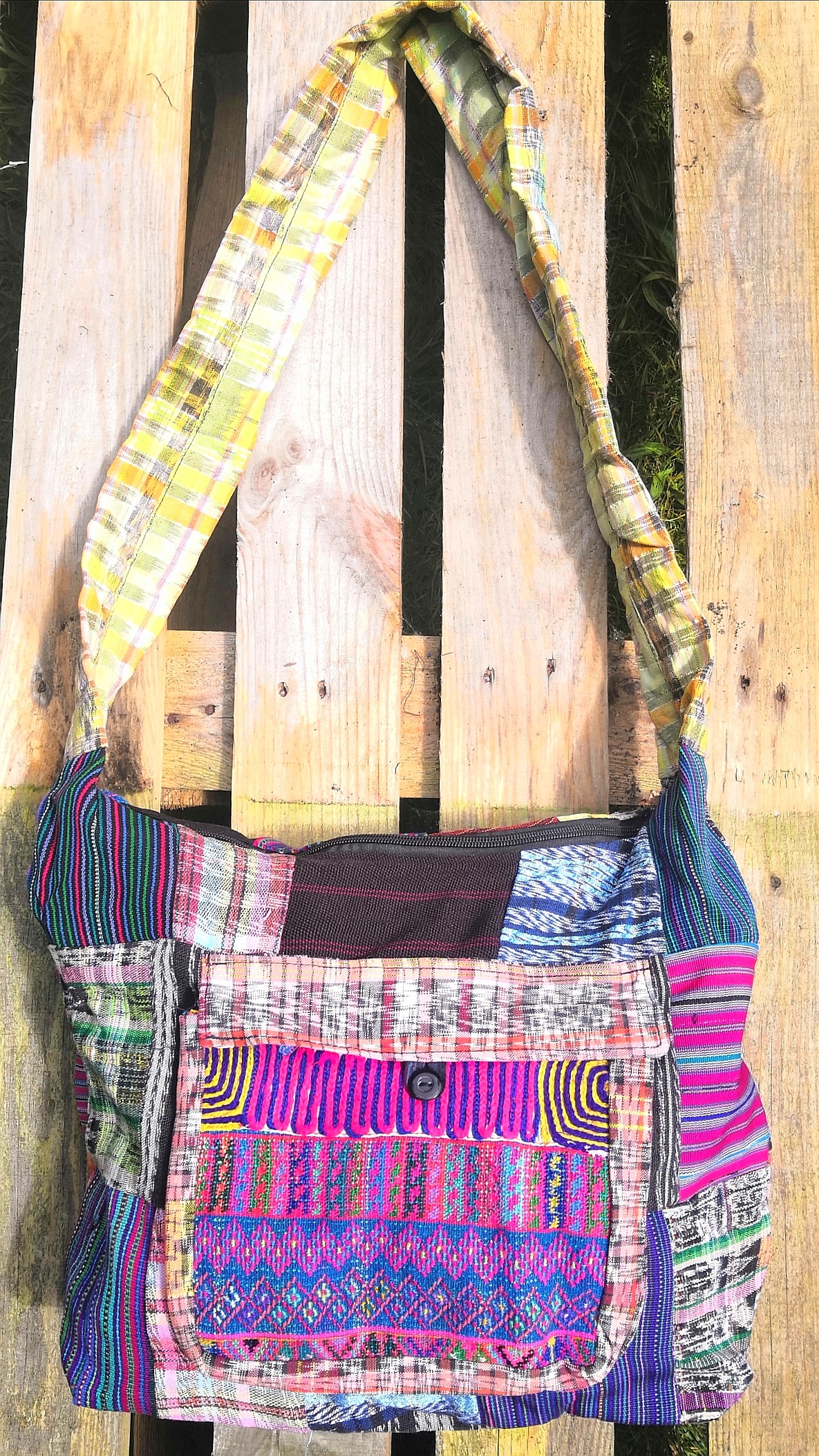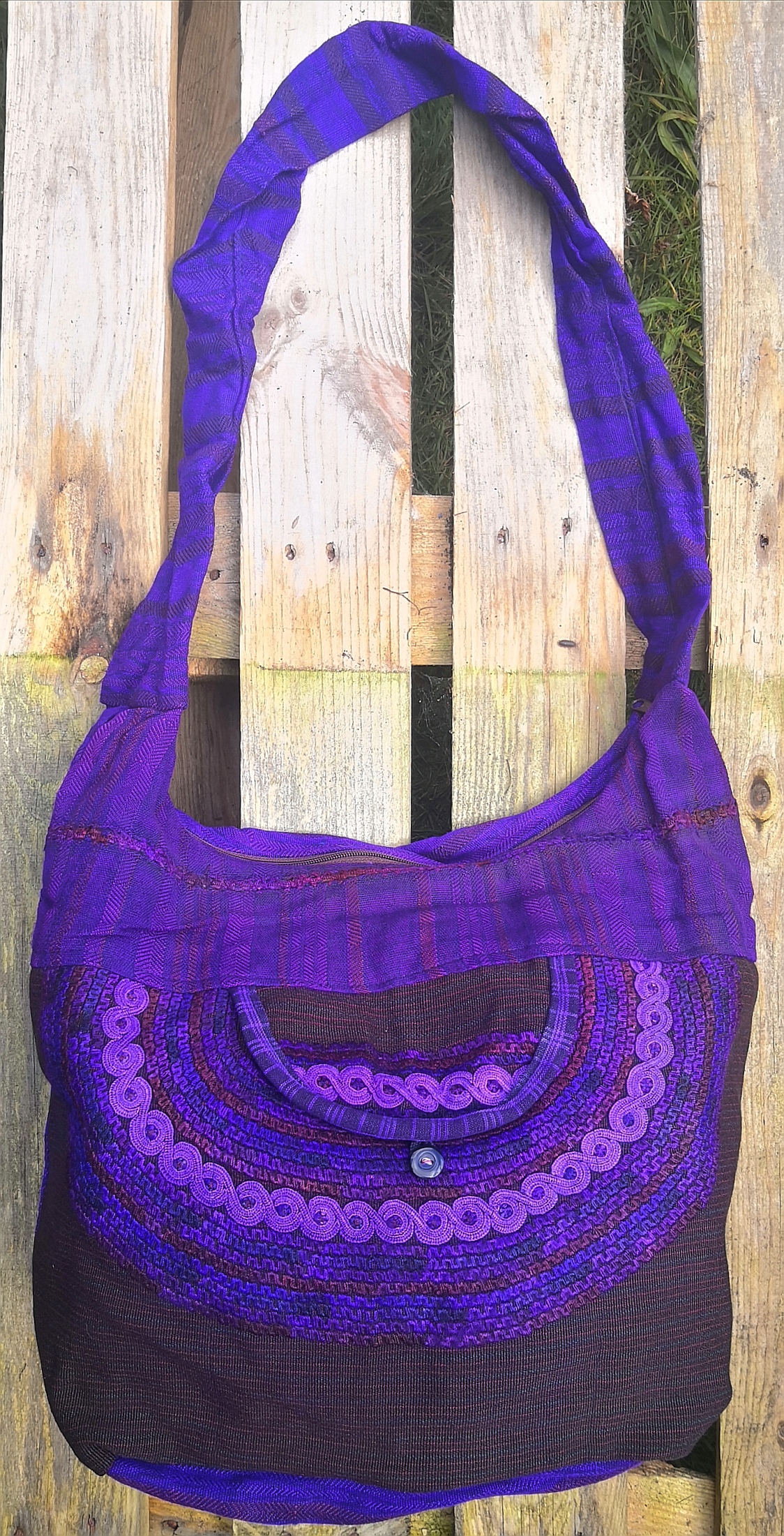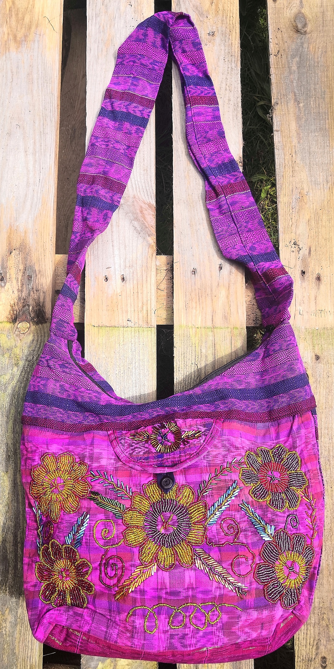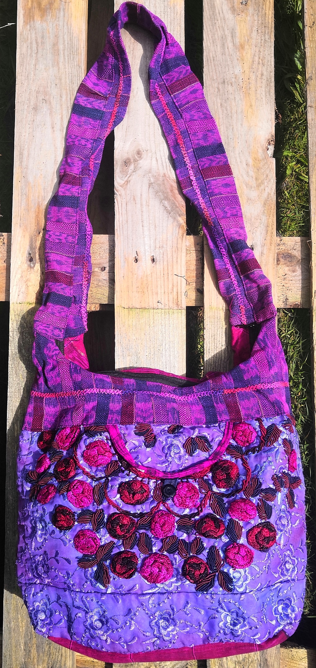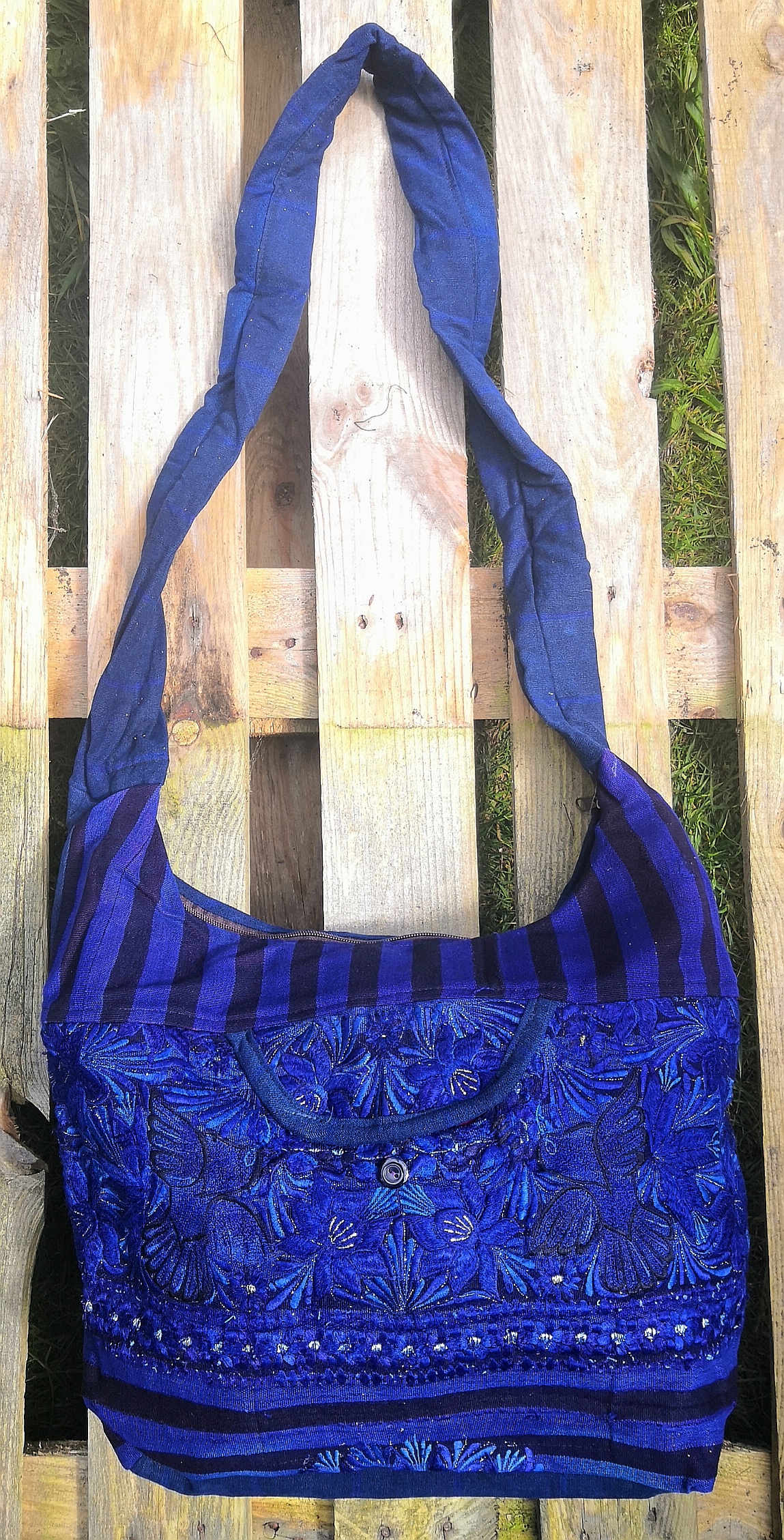 Beautiful hand embroidered large shoulder bag with top zip and buttoned front opening. Flat bottomed. Fits an A4 folder. Both compartments cotton lined. Size: 33cm long/41cm wide. Strap 61cm drop from shoulder to bag.