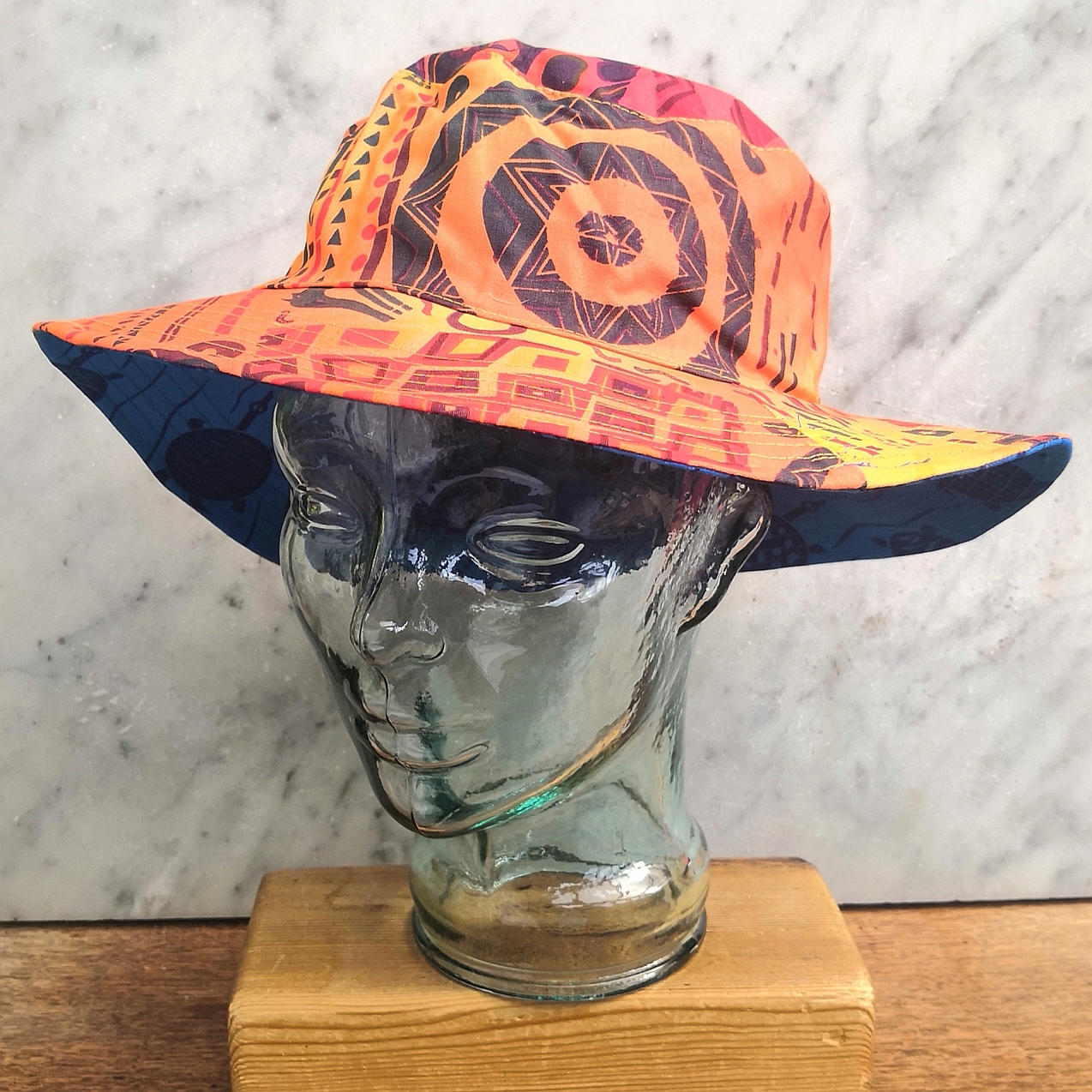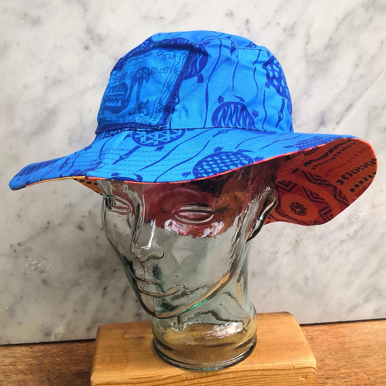 Hand dyed reversible Sunhat, printed and sewn in Zimbabwe. Bright colours and reversible pattern. Every hat is unique. Size L 57-58cm