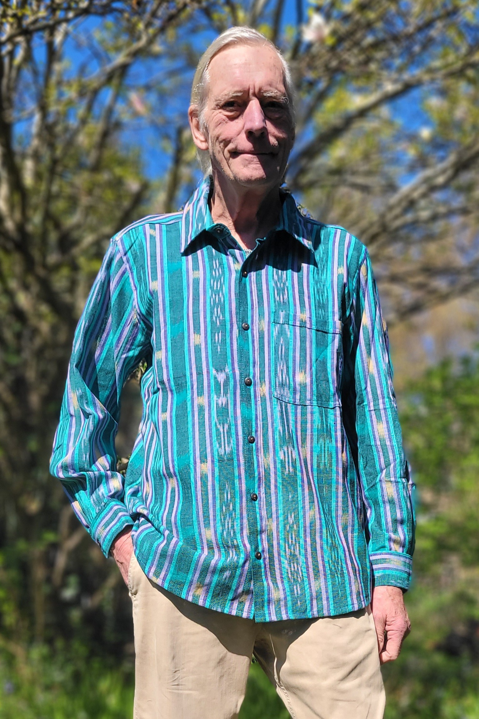 Highest quality handwoven long sleeved shirt with collar. Coconut husk buttons down the front and sewn into the strongly made cuffs. Handy pocket on the left breast. Finely tailored using a traditional weave of vibrant colours in a modern style.