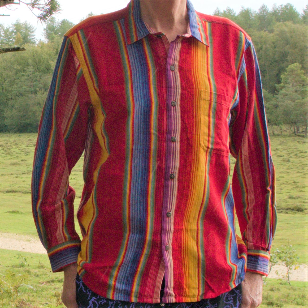 Highest quality handwoven long sleeved shirt with collar. Coconut husk buttons down the front and sewn into the strongly made cuffs. Handy pocket on the left breast. Finely tailored using a traditional weave of vibrant colours in a modern style.