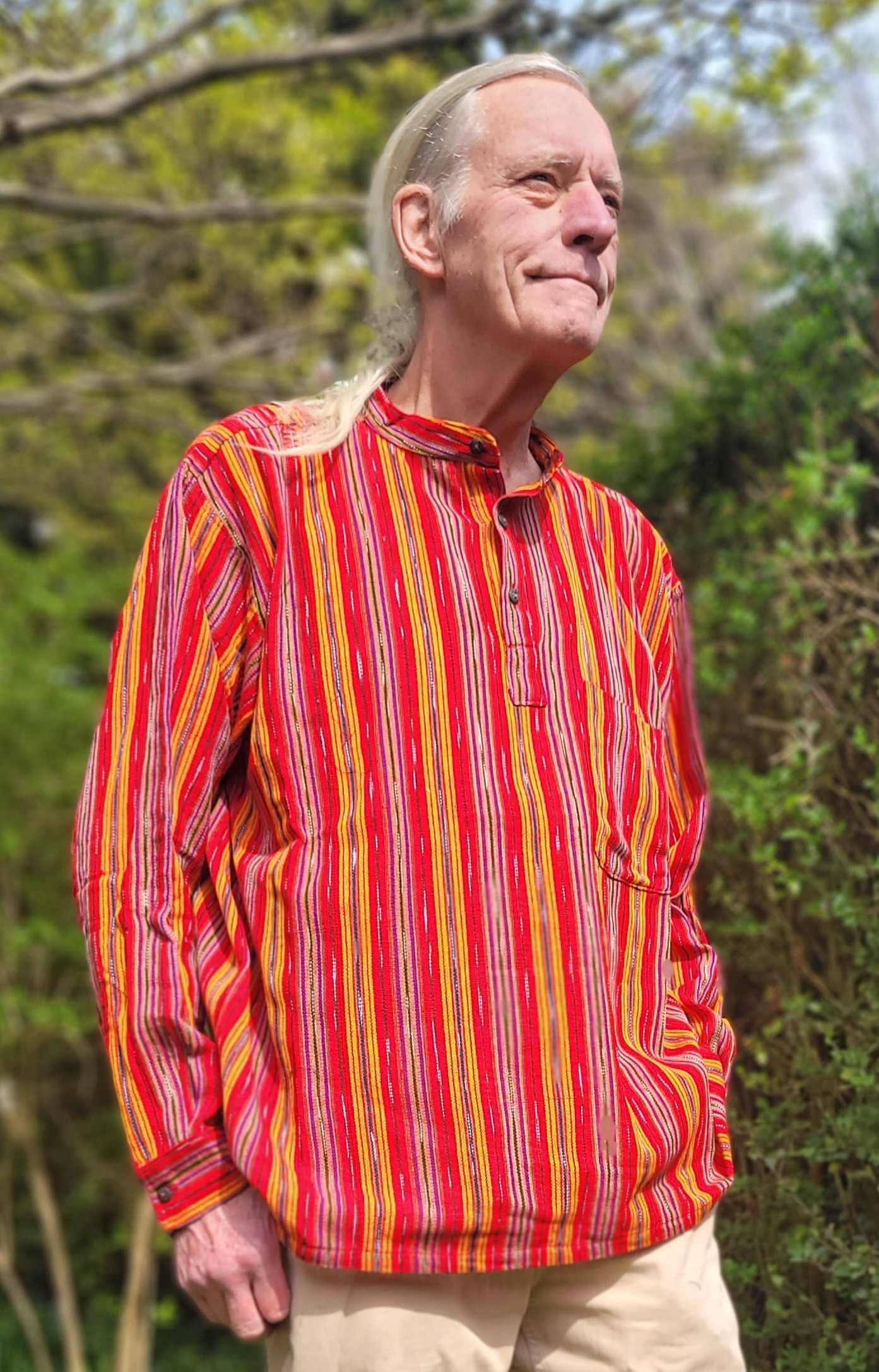 Highest quality handwoven long sleeved shirt. The round neck collar has a 19cm opening lined with coconut husk buttons, also sewn into the strongly made cuffs. Handy pocket on the left breast.