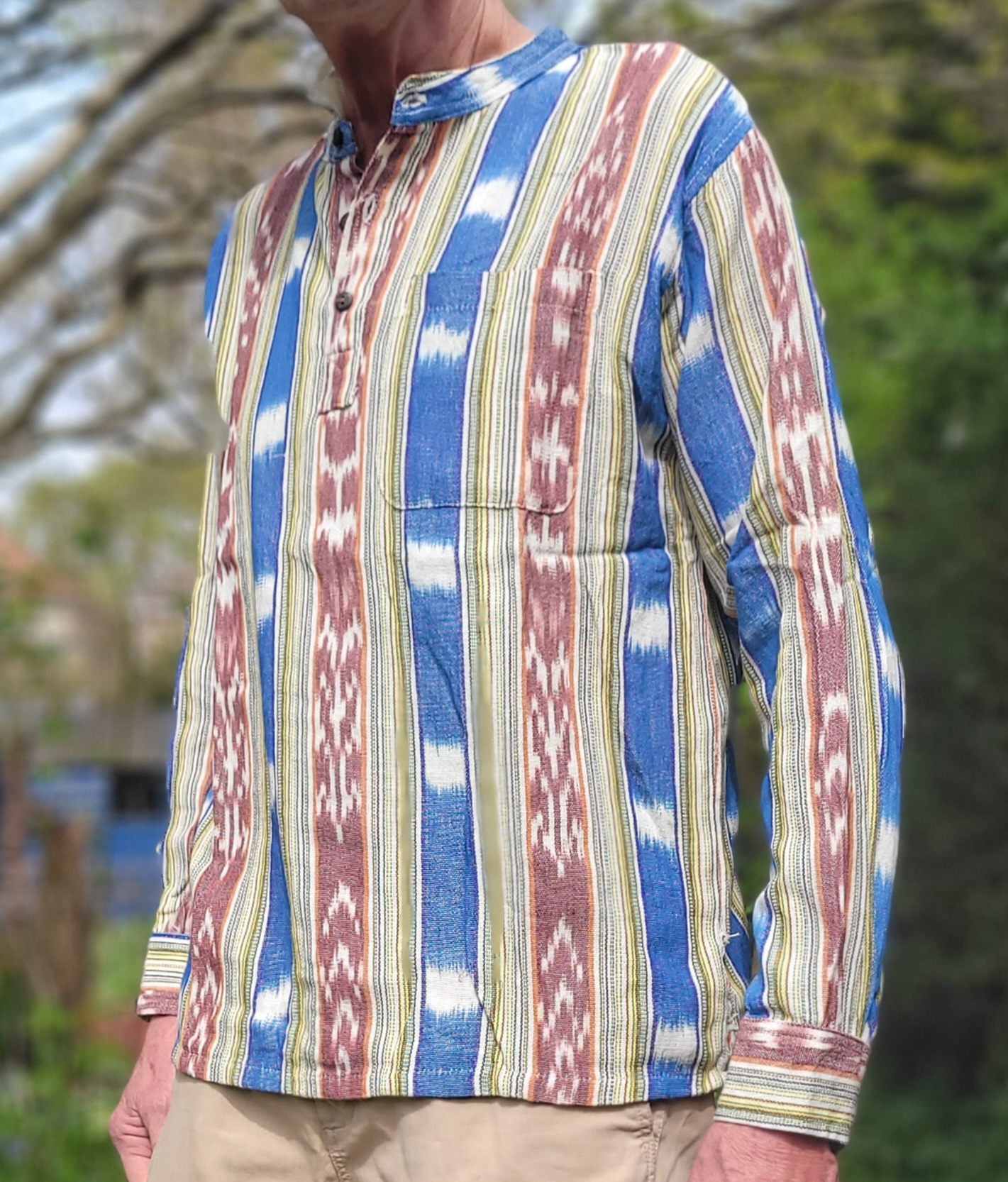 Highest quality handwoven and sewn long sleeved shirt in several beautful colours and available in 5 sizes. The round neck collar has a 19cm opening, lined with coconut husk buttons, also sewn into the strongly made cuffs. Handy pocket on the left breast. We source these in the Guatemalan highlands, they are bought from our tailor whose small family business we have supported for over 20 years. We buy from them just once a year, so these shirts are not available elsewhere, and indeed are quite limited: since Covid, it is becoming more difficult to source the woven fabric, as many of the weavers were forced to find other work at that time and lots of them never returned to the trade. These are a beautiful handmade garment that will last and look great for many years.