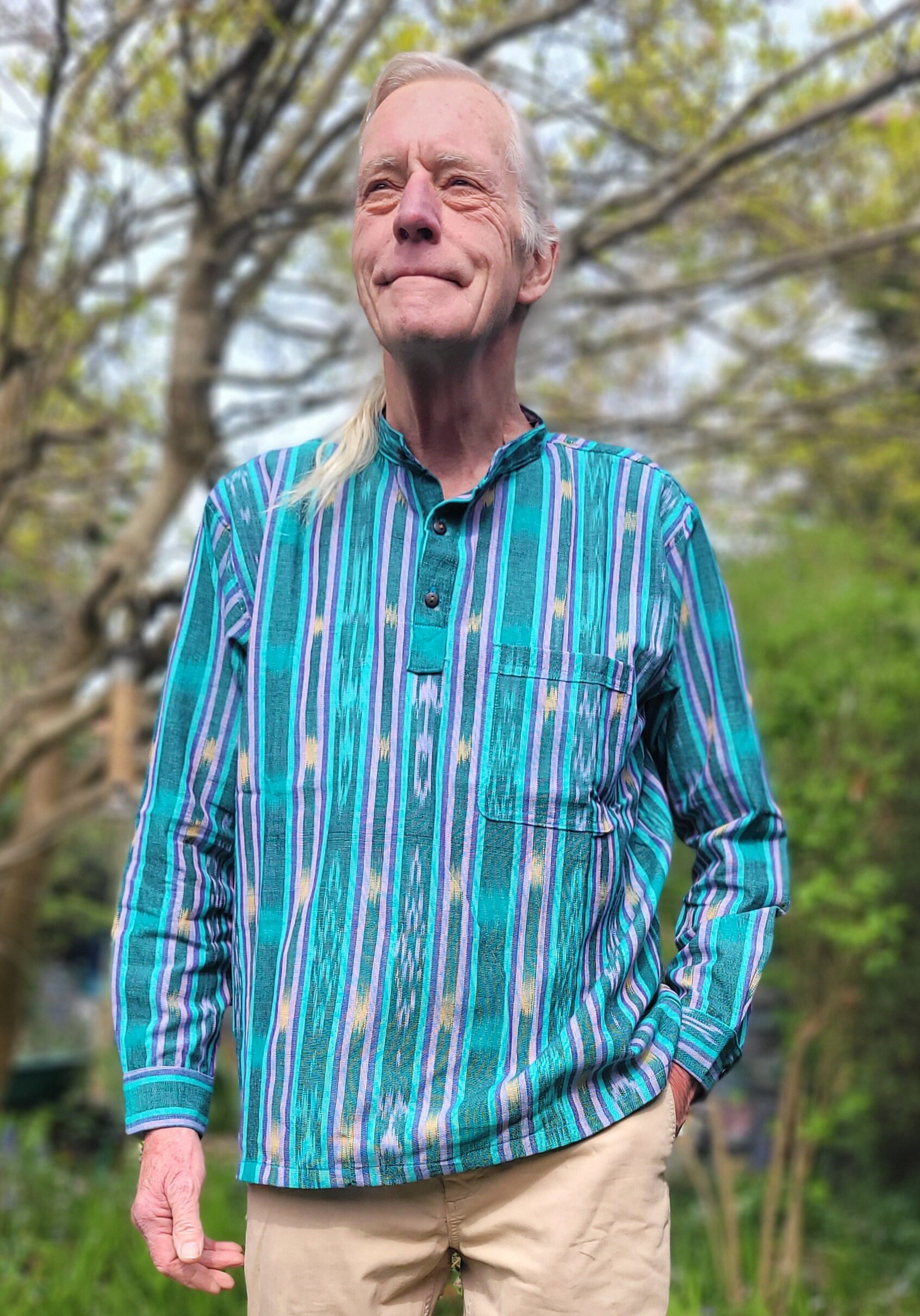 Highest quality handwoven and sewn long sleeved shirt in several beautiful colours and available in 5 sizes. The round neck collar has a 19cm opening, lined with coconut husk buttons, also sewn into the strongly made cuffs. Handy pocket on the left breast. We source these in the Guatemalan highlands, they are bought from our tailor whose small family business we have supported for over 20 years. We buy from them just once a year, so these shirts are not available elsewhere, and indeed are quite limited: since Covid, it is becoming more difficult to source the woven fabric, as many of the weavers were forced to find other work at that time and lots of them never returned to the trade. These are a beautiful handmade garment that will last and look great for many years.