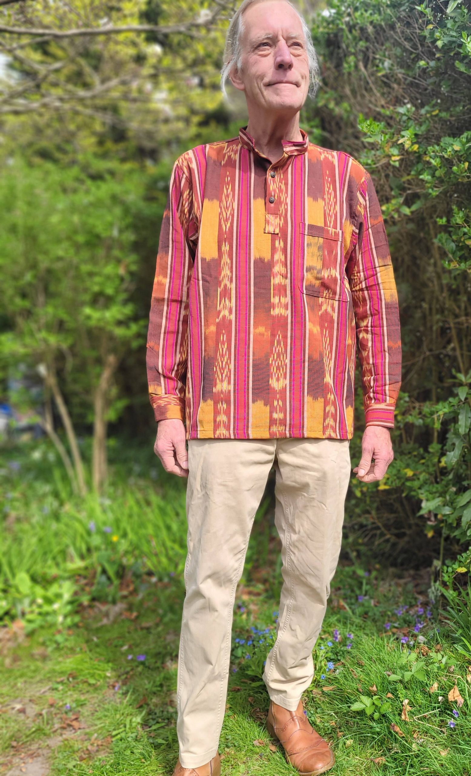 Highest quality handwoven and sewn long sleeved shirt in several beautiful colours and available in 5 sizes. The round neck collar has a 19cm opening, lined with coconut husk buttons, also sewn into the strongly made cuffs. Handy pocket on the left breast. We source these in the Guatemalan highlands, they are bought from our tailor whose small family business we have supported for over 20 years. We buy from them just once a year, so these shirts are not available elsewhere, and indeed are quite limited: since Covid, it is becoming more difficult to source the woven fabric, as many of the weavers were forced to find other work at that time and lots of them never returned to the trade. These are a beautiful handmade garment that will last and look great for many years.