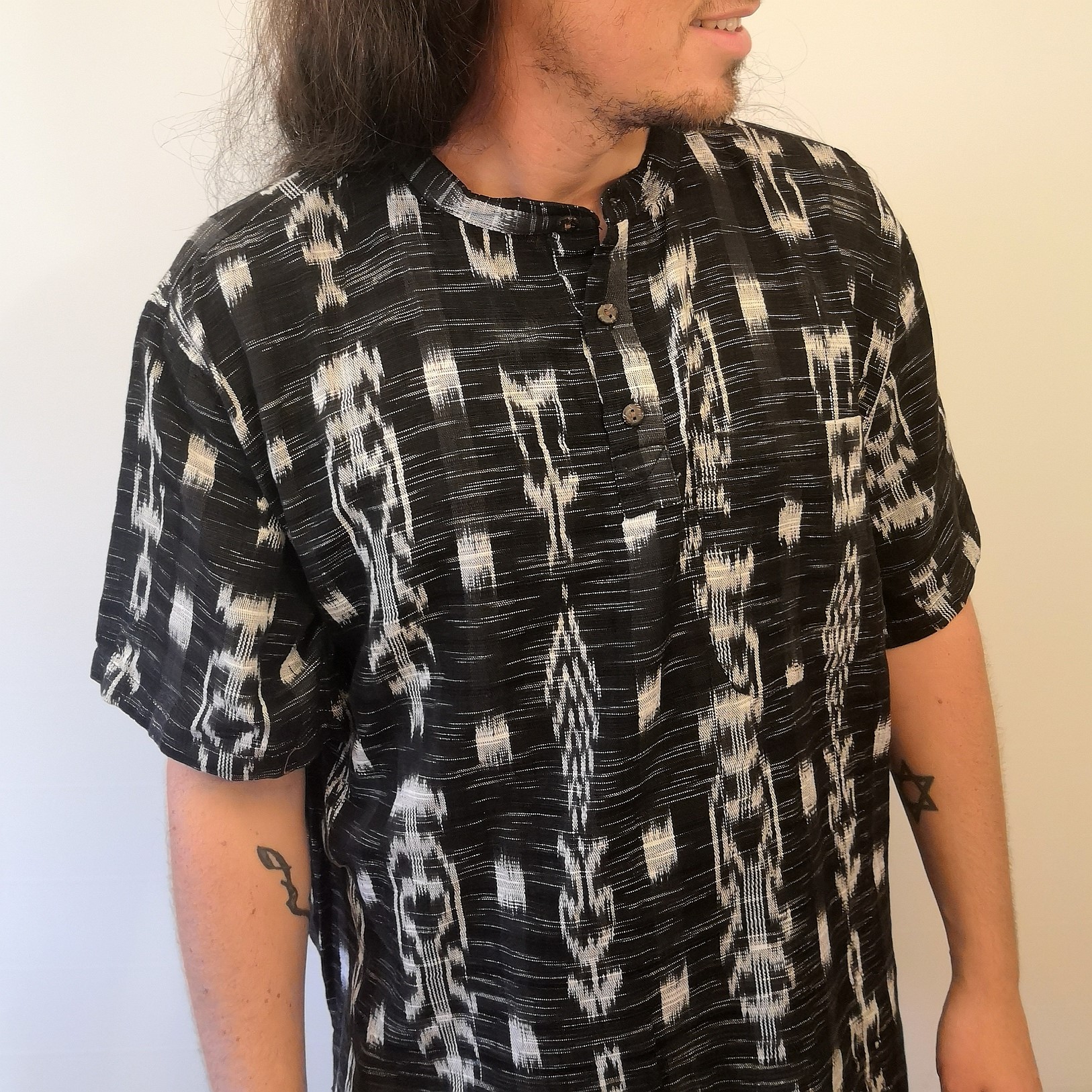 Highest quality handwoven short sleeved shirt. The round neck collar has a 19cm opening lined with coconut husk buttons. Handy pocket on the left breast. Finely tailored using a traditional weave of vibrant colours in a modern style.