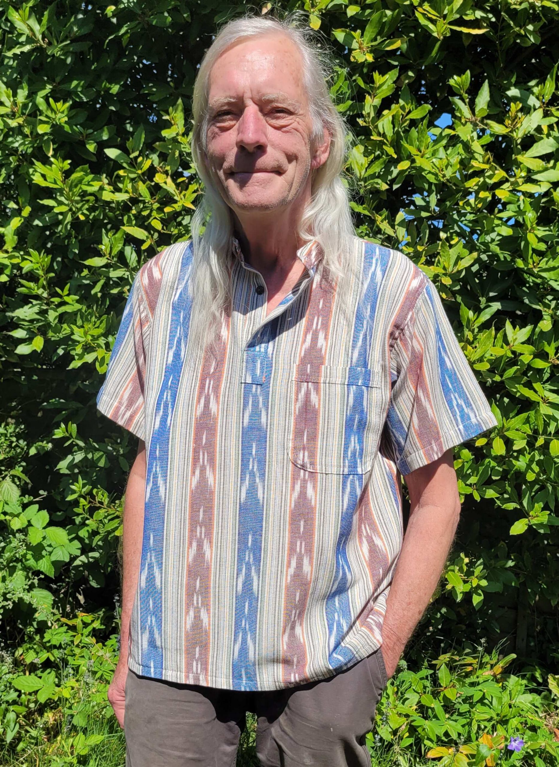 Highest quality handwoven short sleeved shirt. The round neck collar has a 19cm opening lined with coconut husk buttons. Handy pocket on the left breast. Finely tailored using a traditional weave of vibrant colours in a modern style.