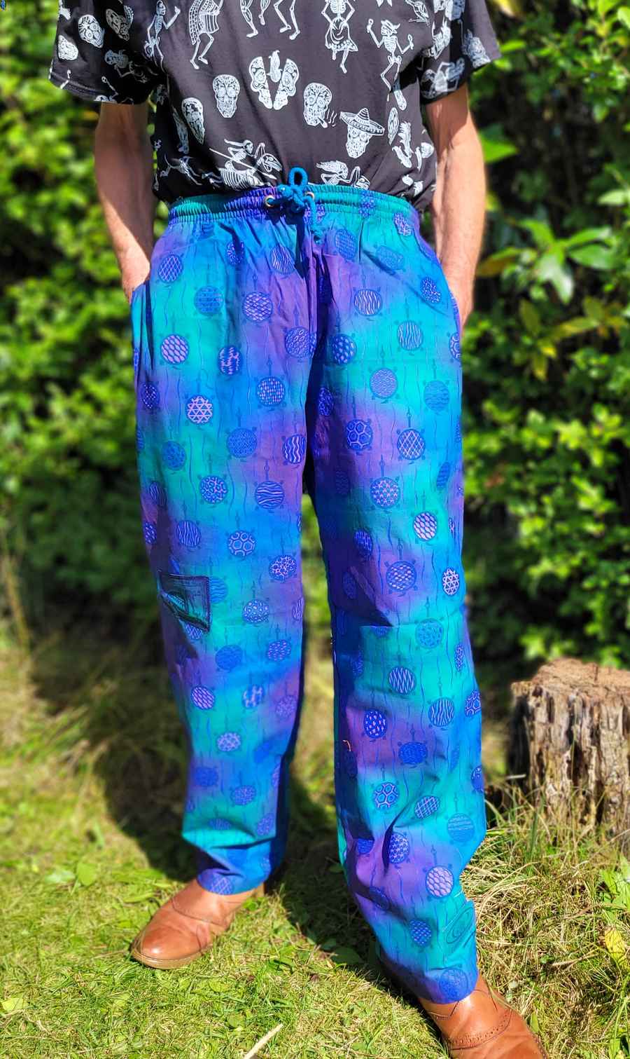 Hand dyed and hand screen printed, 100% cotton trousers from Zimbabwe. Perfect for climbing, yoga, cycling or hanging around! We have been working with Zimbabalooba since 1999 and their small business in Harare, produce a fantastically strong and well made product in an amazing blend of colours; a product our outgoing customers are sure to appreciate.