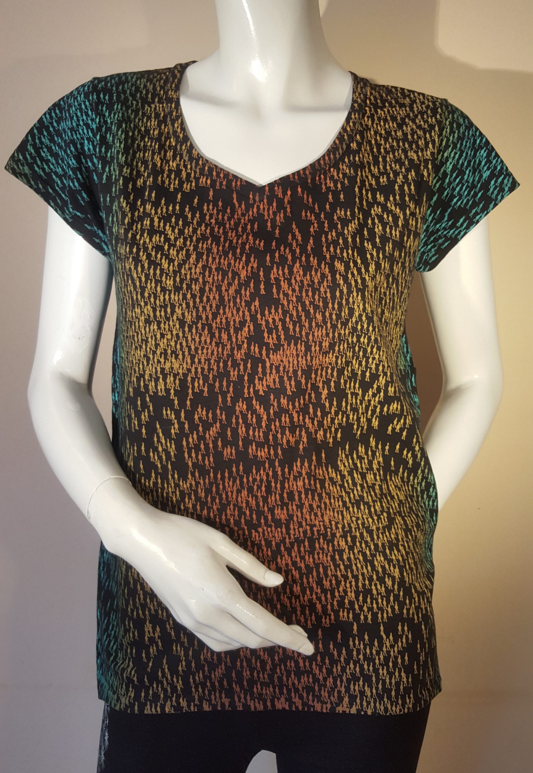 Ideal for free thinkers who like individuality. Unique all over hand screen printed women’s top made in England using environmentally friendly water based inks to produce a high quality garment with a long lasting print.