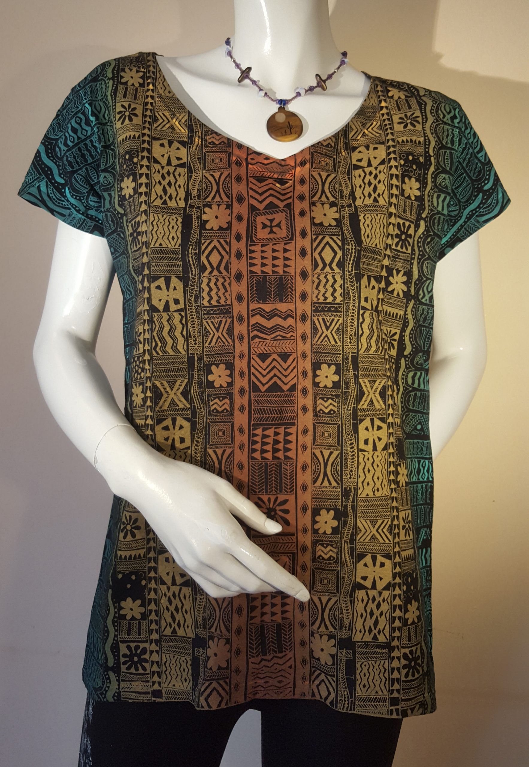 Ideal for free thinkers who like individuality. Unique all over hand screen printed women’s top made in England using environmentally friendly water based inks to produce a high quality garment with a long lasting print.